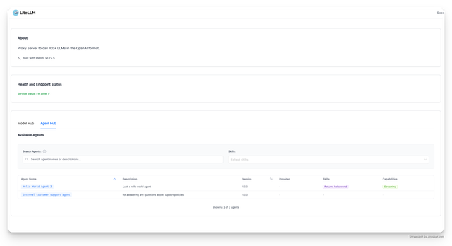Share pre-built agents (A2A spec) across your organization. Users can discover and use agents without rebuilding them.